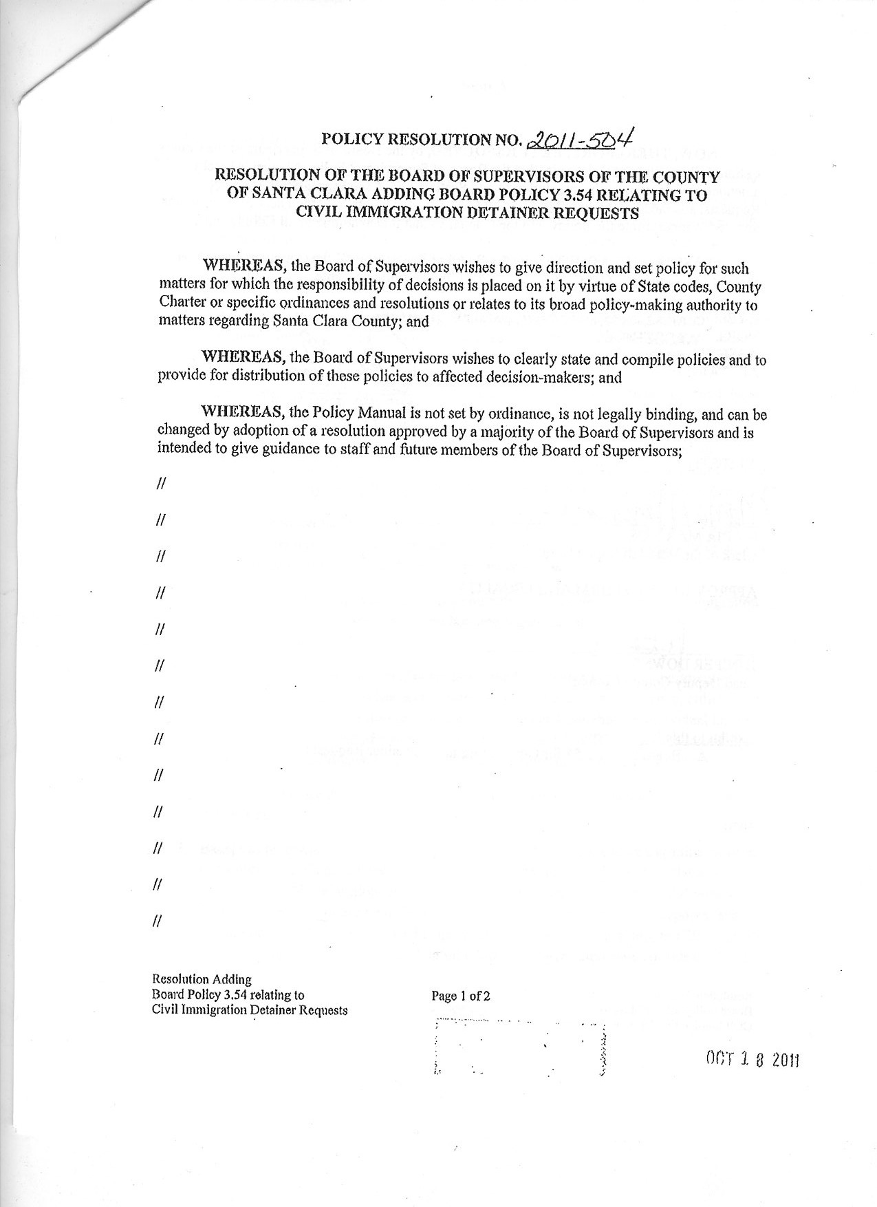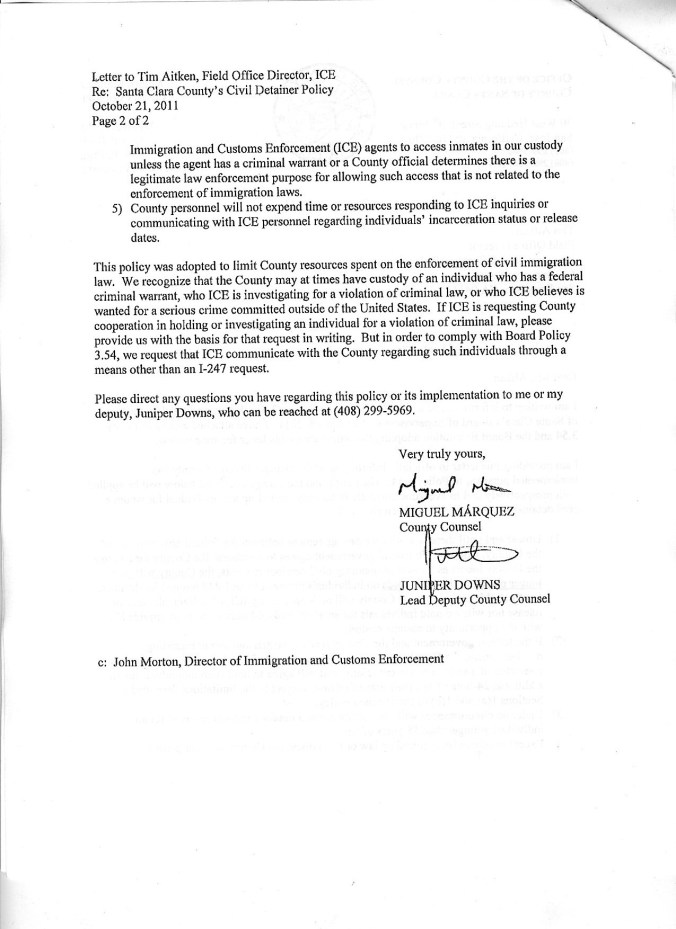 On October 21, 2011, just days after the Santa Clara County Board of Supervisors passed a detainer policy praised by many community members, legal service providers, and immigrant rights advocates as one that balances public safety, honors civil rights, and protects immigrants, County Counsel Miguel Marquez sends off a letter to ICE notifying them of our County’s official stance. Click below to read the letter….