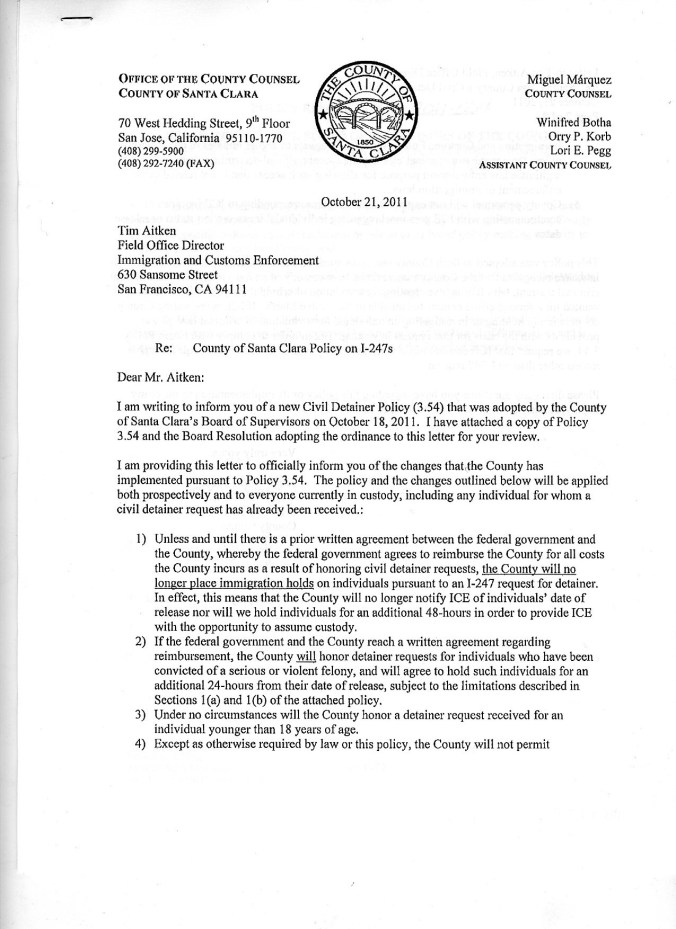 Santa Clara County Counsel Sends ICE New Detainer Policy for the County